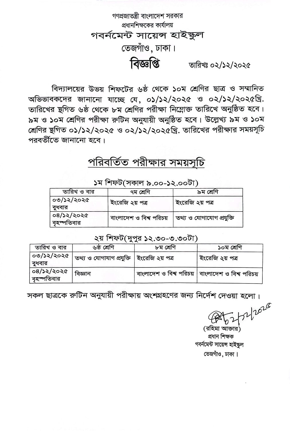 দিবা শিফট ক্লাস রুটিন